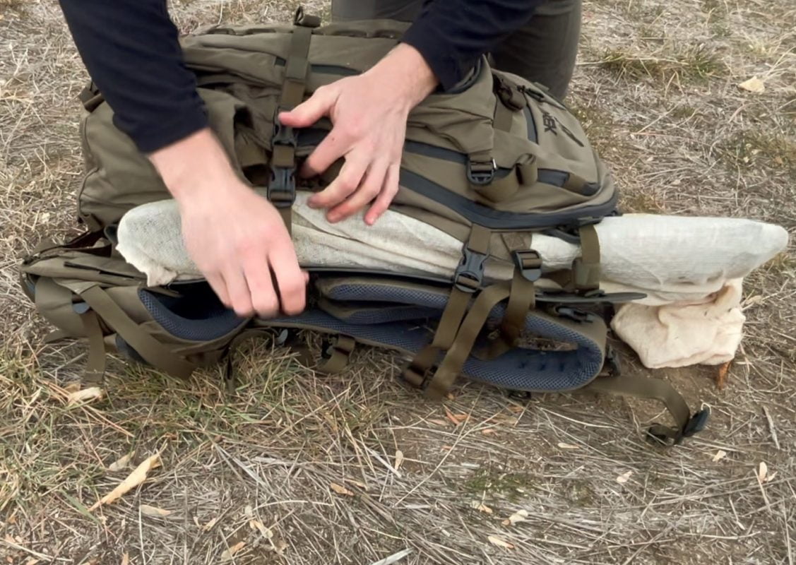 The Alpha 3200 separates from the frame allowing you to put gear or game securely between the pack and the frame. The rear compartment also separates from the main pack allowing additional gear or meat to be carried.